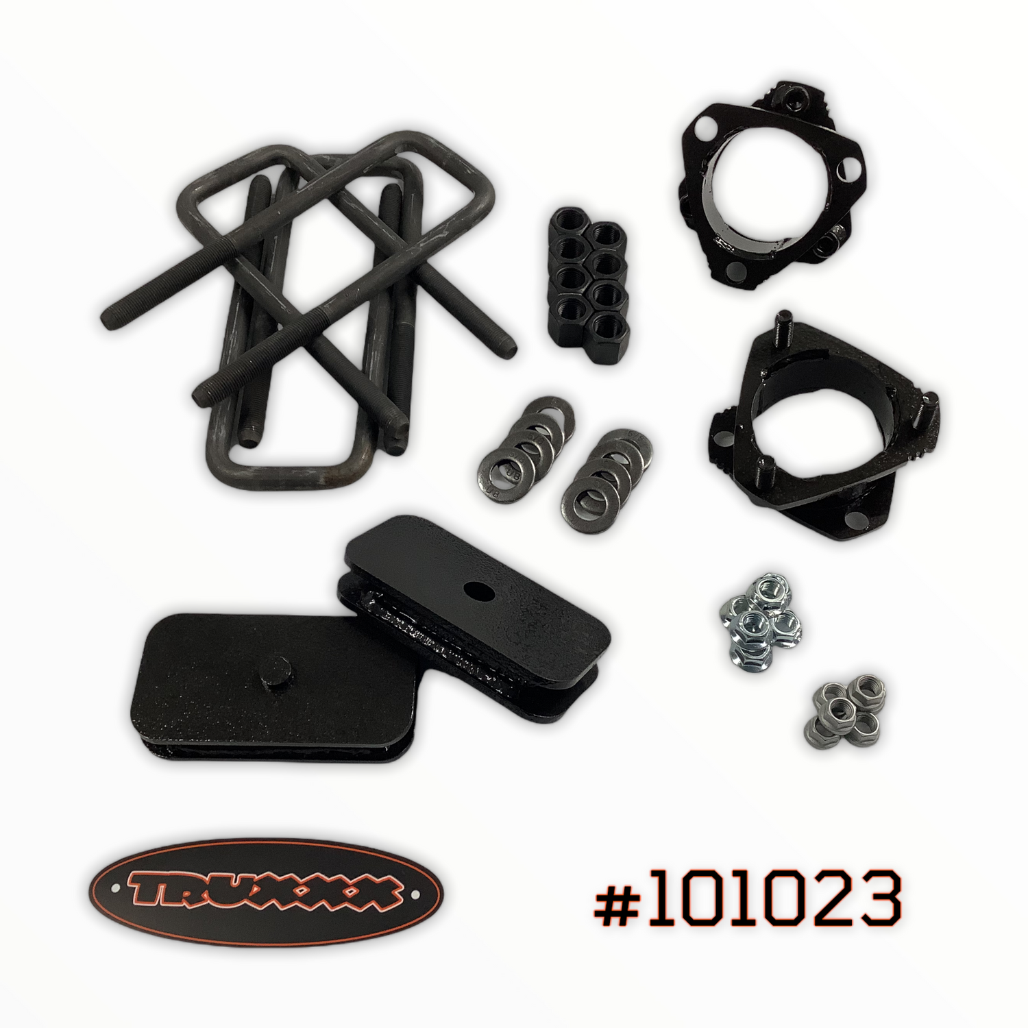This kit contains two front strut spacers, rear blocks, US Made Hi Carbon steel u-bolts and all the hardware needed. We included detailed instructions and complete alignment specs.