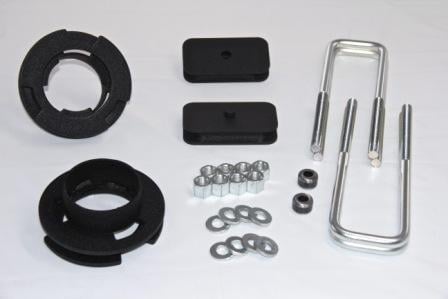 Each kit is welded using the latest US Made welders and triple checked to ensure proper fitment. Each kit contains two front spring spacers, two shock spacers, American hi chromium steel u-bolts and hardware, 2 rear blocks, all hardware needed, detailed instructions and complete alignment specs. Recommended installation time is approx 3 hours + alignment and a 33” tall tire are commonly used.